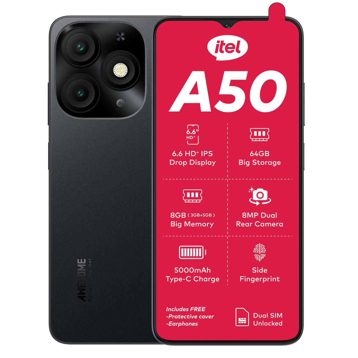The Itel A50 64GB Dual SIM Black is a budget-friendly smartphone that balances practicality and performance. With 64GB storage, dual SIM support, and a bright display, it’s perfect for everyday use like social media, messaging, and light apps. The Black finish provides a sleek, classic design, while the long-lasting battery ensures reliable use throughout the day. A great choice for students, first-time users, or as a backup phone.